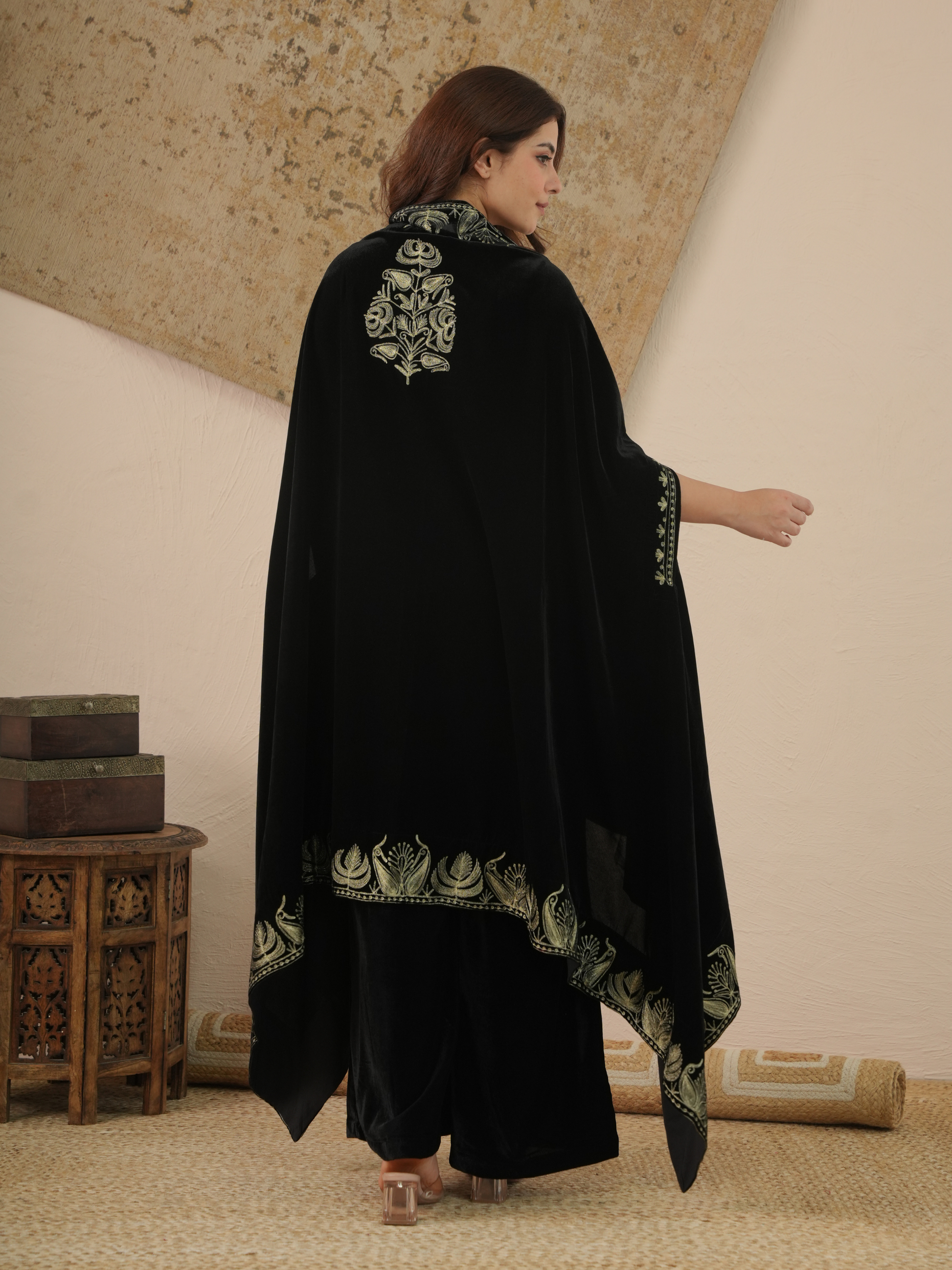 Make a regal statement with our Afsana Black Velvet Co-ord Set with Shrug, a perfect blend of modern sophistication and traditional artistry. Crafted from luxurious velvet, this elegant ensemble features a sleeveless velvet top and matching wide-leg pants, complemented by an intricately embroidered shrug showcasing exquisite zari floral motifs. Ideal for festive evenings, winter celebrations, and formal gatherings, this set brings effortless grace and grandeur to your wardrobe.