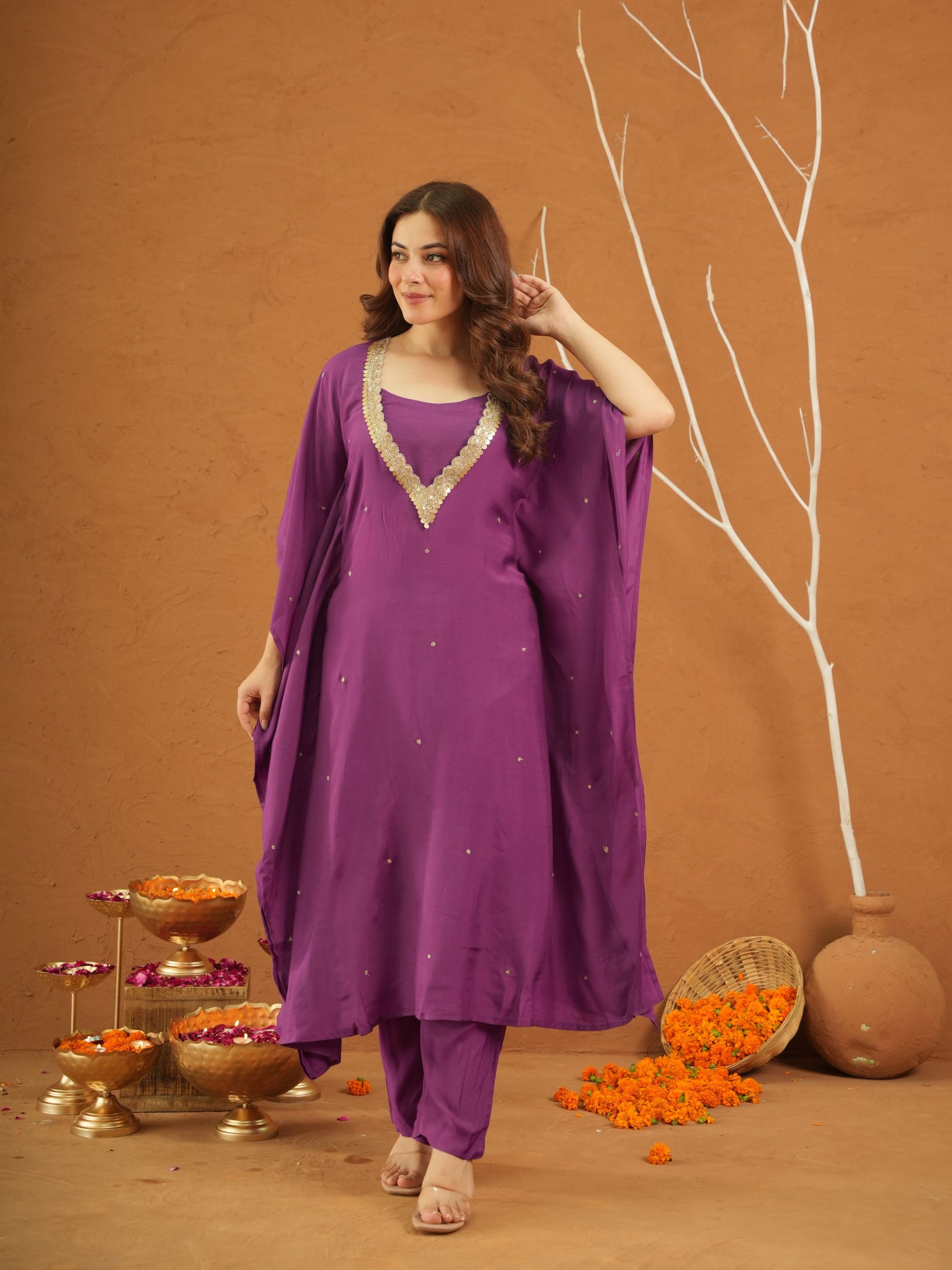 Step into royal elegance with our Kohinoor Purple Maslin Aari Kaftan Set, featuring a flowy kaftan-style kurta crafted in luxe maslin fabric. The deep purple hue is elevated with delicate hand-done aari embroidery along the neckline, while subtle scattered motifs add a refined charm. Paired with matching straight pants, this ensemble is a perfect blend of comfort and festive sophistication—ideal for weddings, sangeet nights, and cultural celebrations.
