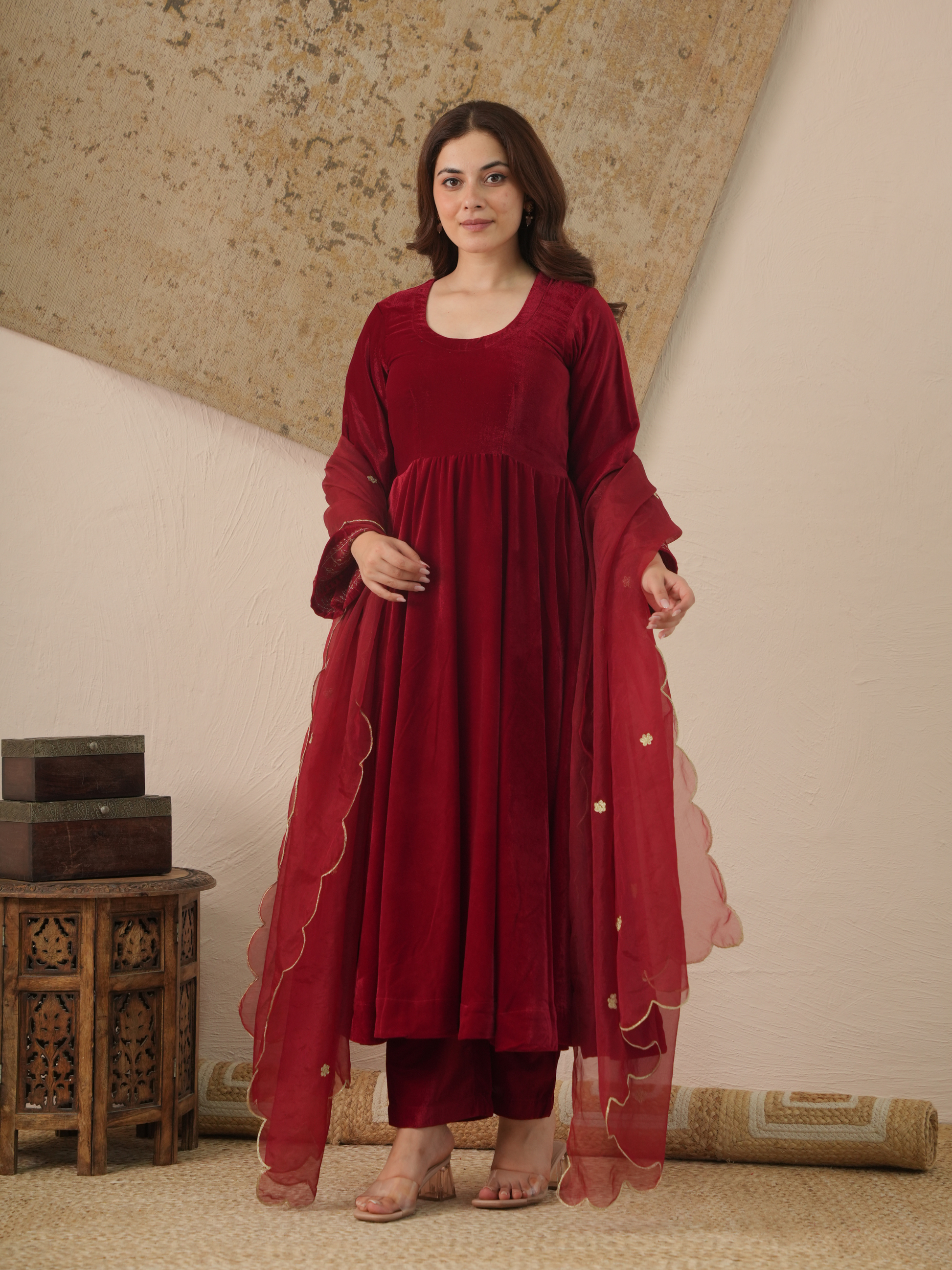 Evoke timeless elegance with our Meher Maroon Velvet Suit Set, designed to add regal charm to your festive wardrobe. The plush velvet kurta, paired with matching pants, drapes beautifully and offers a luxurious feel. The look is completed with a sheer organza dupatta detailed with scalloped edges and dainty golden embroidery — perfect for weddings, evening celebrations, and festive gatherings.