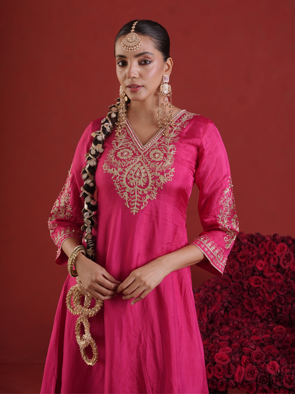 Exude regal elegance with this pink silk kurta pant set, crafted for refined festive dressing. Designed in a flattering A-line silhouette, the silk kurta features exquisite zari, sequin, and pearl embroidery that highlights the neckline and sleeves with a soft luminous charm. Paired with matching silk pants for a seamless look, the ensemble is completed with a soft organza dupatta, detailed with an elegant embellished border. Perfect for weddings, festive celebrations, and special occasions, this set blends traditional artistry with timeless sophistication.