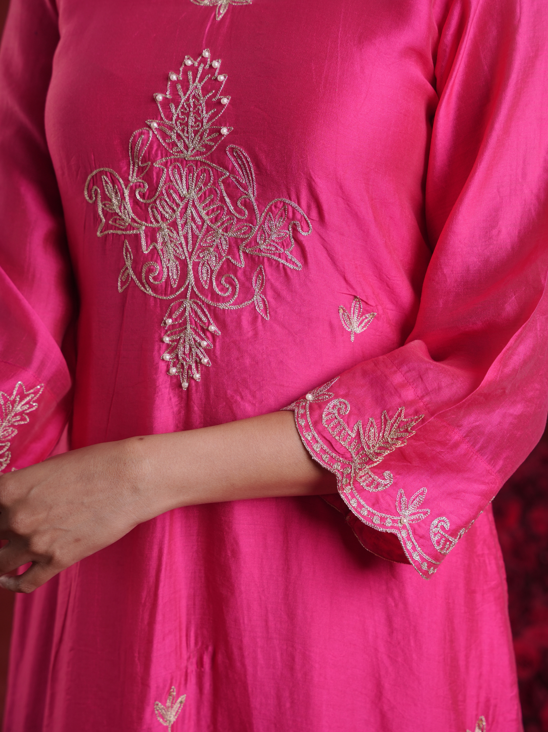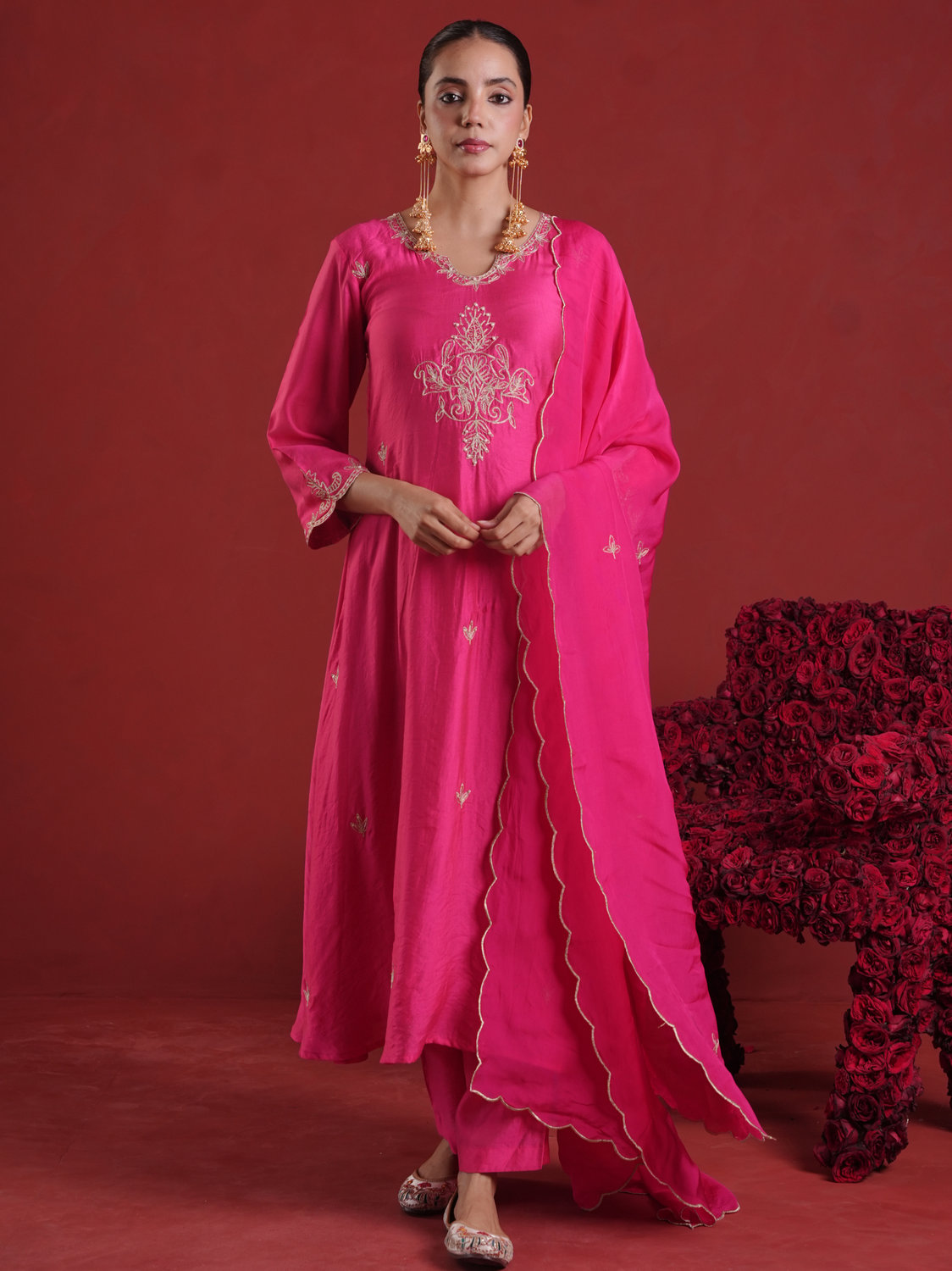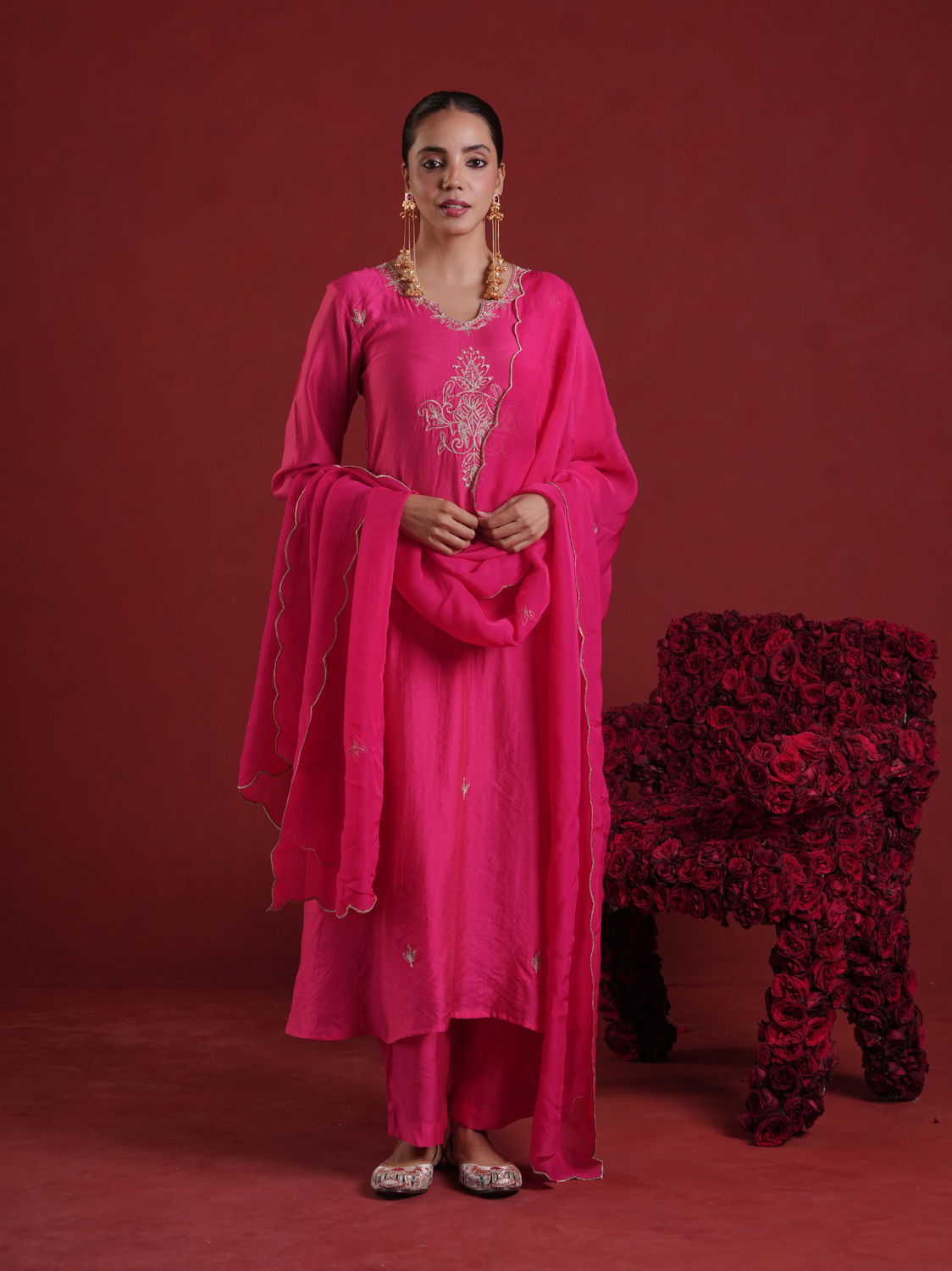 Fuchsia Pink Embellished Chanderi Kurta Set with Organza Dupatta